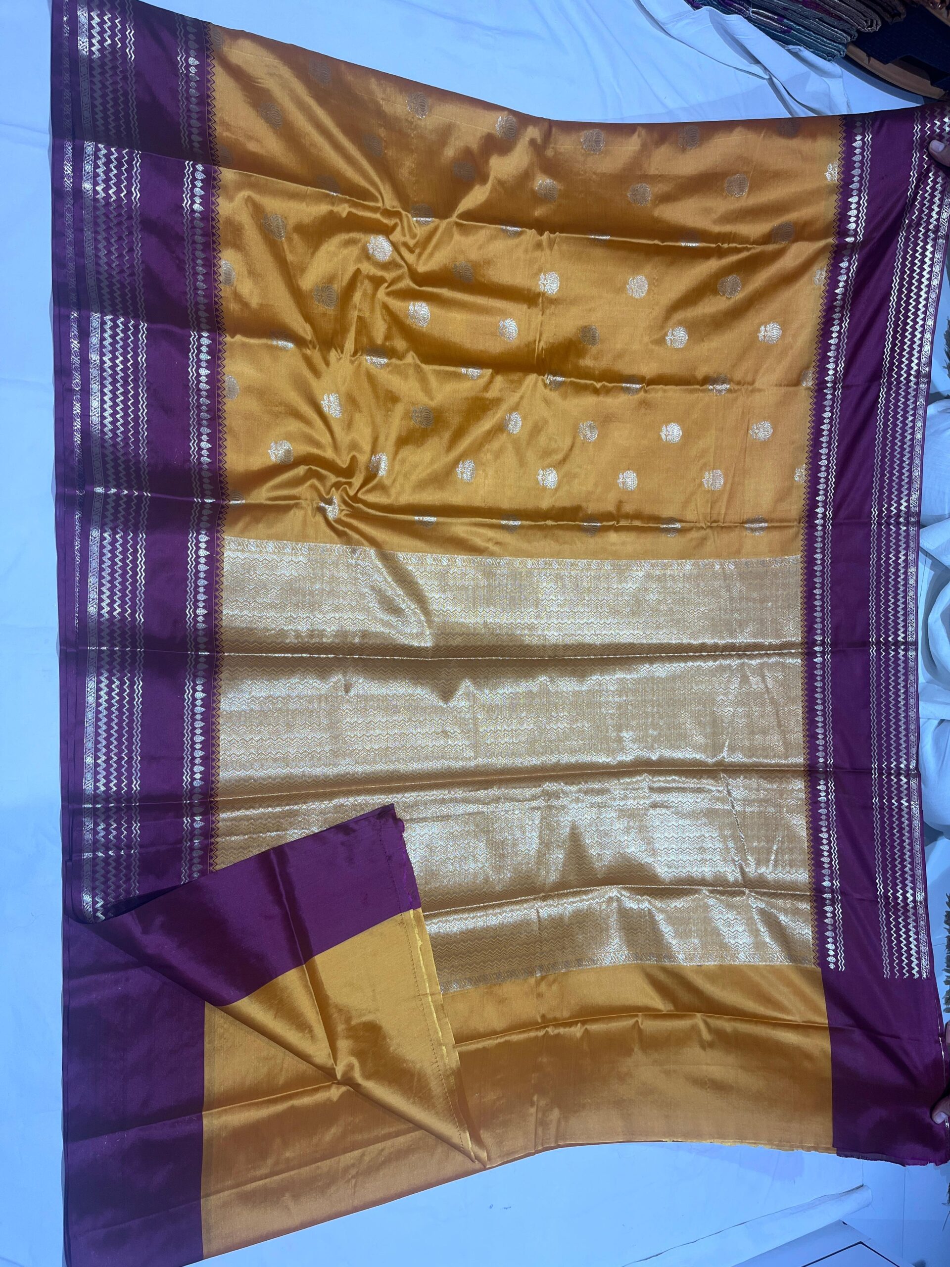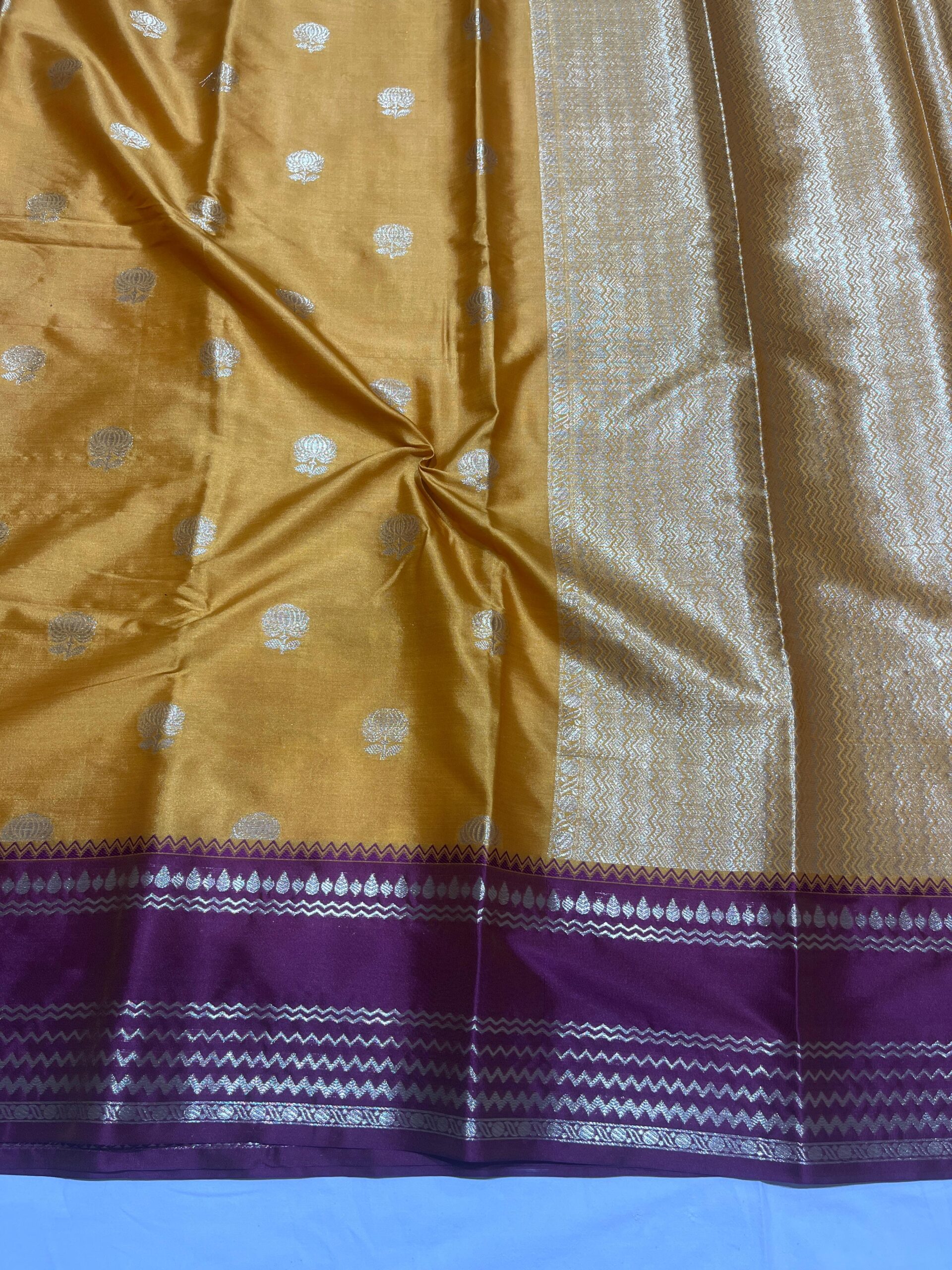 This saree features a vibrant yellow hue that symbolizes joy, warmth, and celebration. The contrast matching design beautifully enhances the richness of the fabric, while the delicate booti pattern adds a touch of classic Banarasi artistry.